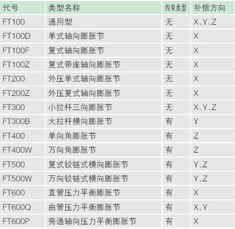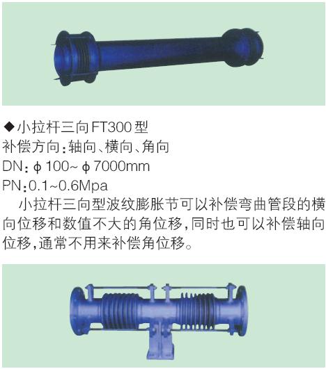 ◆大拉桿橫向FT300B 型 補(bǔ)償方向:橫向(任意) DN:φ100~φ4000mm PN:0.1~2.5Mpa 大拉桿橫向型波紋膨脹節(jié)可以補(bǔ)償彎曲管段的 橫向位移和數(shù)值不大的角位移,通常不用來(lái)補(bǔ)償角 位移。它具有承受內(nèi)壓推力的能力。 ◆通用FT100型 補(bǔ)償方向: 軸向、橫向、角向 DN:φ40~φ12000mm PN:0.1~2.5Mpa 通用型波紋補(bǔ)償器由一組波紋管和結(jié)構(gòu)件組成, 可分焊接式、法蘭式兩種,主要用于補(bǔ)償管線的軸向 位移,通用補(bǔ)償器屬無(wú)約束型,內(nèi)壓推力必須由主固 定架來(lái)承擔(dān)、產(chǎn)品上的黃色小拉桿主要是運(yùn)輸過(guò)程 中的剛性支承或作為預(yù)變形調(diào)節(jié)用,它不是承力件, 該類補(bǔ)償器結(jié)構(gòu)簡(jiǎn)單,性價(jià)比好,在管線上可能之處 應(yīng)優(yōu)先予以考慮。